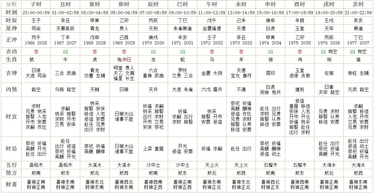 宜:纳采,订盟,祭祀,祈福,安香,出火,修造,出行,开市,移徙,入宅,动土,安葬,破土